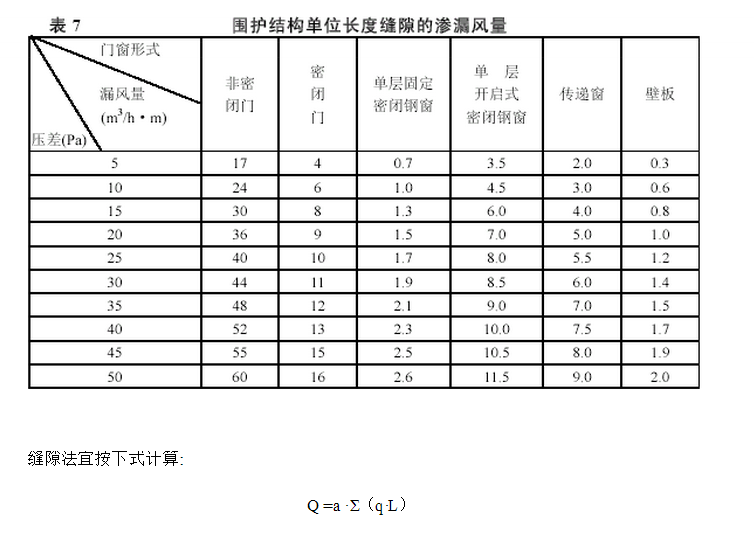 1 選用縫隙法來核算滲漏風(fēng)量,既思考了潔凈室圍護結(jié)構(gòu)的氣密性,又思考了室內(nèi)保持不一樣的壓差值所需的正壓風(fēng)量。因而,縫隙法比按房間的換氣次數(shù)預(yù)算法較為合理和準(zhǔn)確。 單位長度縫隙滲漏空氣量用公式核算是對比艱難的,一般是經(jīng)過不一樣型式的門、窗進行屢次實驗的數(shù)據(jù)核算后得出的。表 7是對G內(nèi)潔凈室的 20多種常用的門、窗在實驗室進行了很多的實驗,獲得的數(shù)據(jù),盡管這些年潔凈室門窗的資料和型式有很大的開展,但現(xiàn)在還有有些潔凈室依然選用鋼制密封門窗。故表中數(shù)據(jù)仍可供規(guī)劃時參閱。